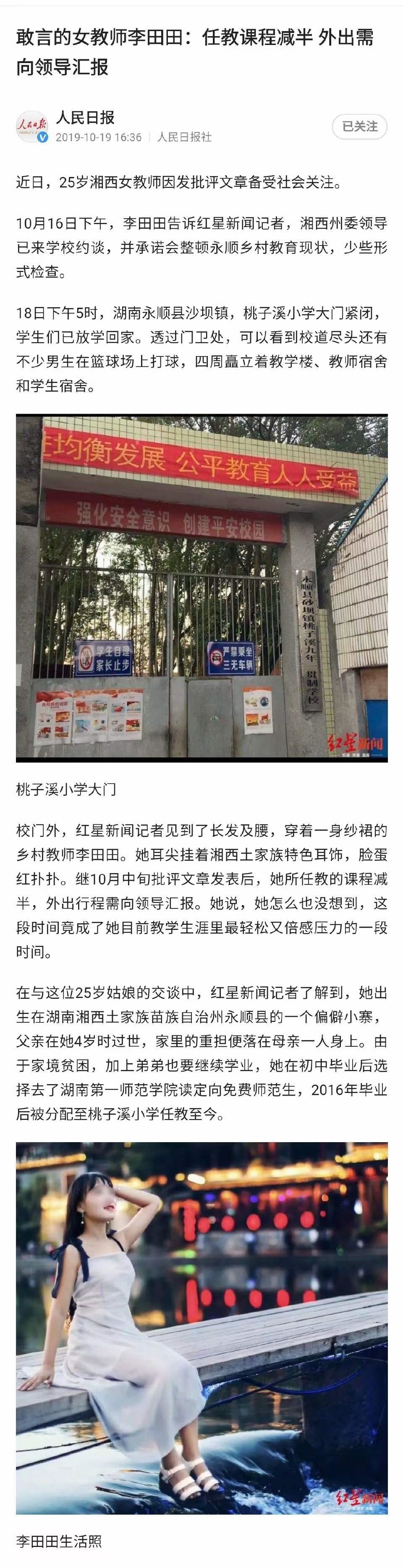 李田田被约谈后,人民日报刊文:敢言的女教师李田田