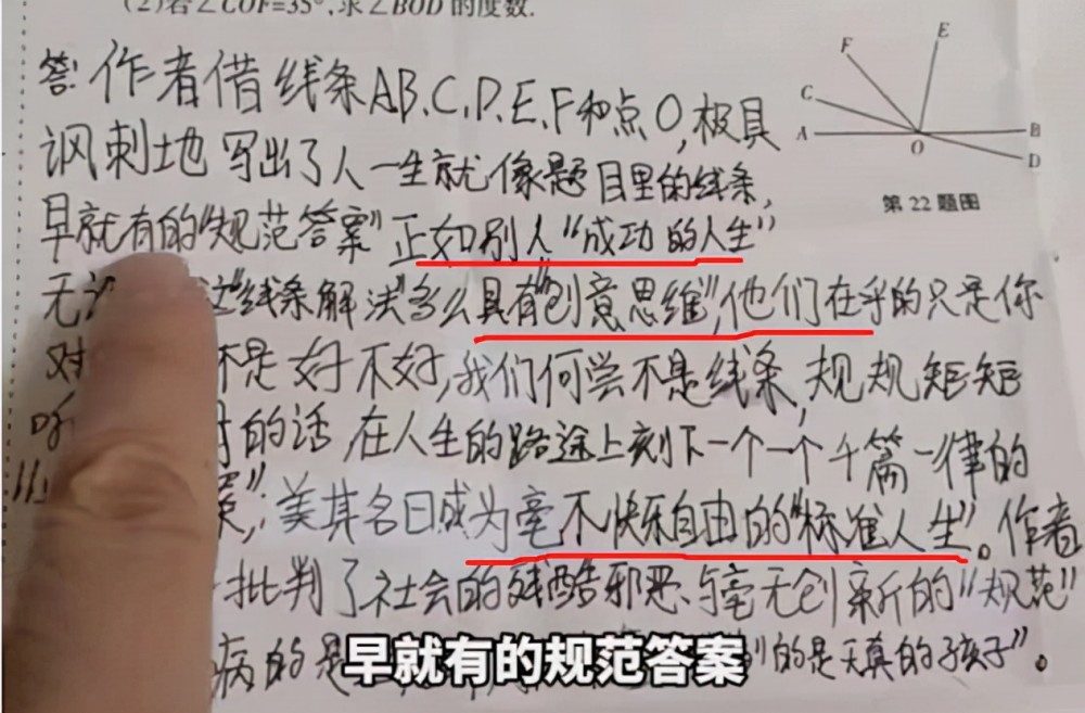 在她的回答中认为:人一生就像题目里的线条,早就有的“规范答案”正如别人“成功的人生”!将自己比作是一根线条,将人生的路上刻下一个又一个千篇一律“标准答案”。