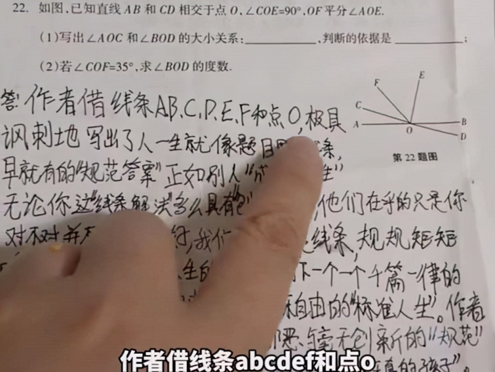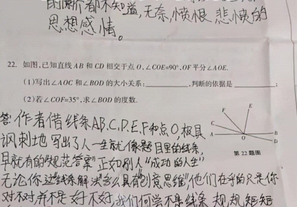 更是因为广大网友从女生的数学试卷中,看到了她在文学方面的才华,原本是一道解析题,学生需要根据论证,证明各个角之间的大小关系,并且写出判断的依据,同时还有求出相关角的度数?