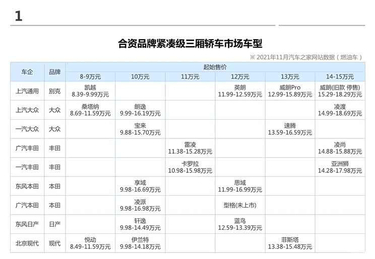其次,从外部市场环境看,威朗Pro从旧款15万元以上偏中型车的价格区间中主动转移出来,退到“更广阔的海洋”中,安插到在销售体量和成长潜力更大的价格区间内,不仅能与那些受年轻人偏爱的思域、菲斯塔等产品对标,同时,凭借运动的定位也能与这一市场销售排名靠前的卡罗拉、轩逸、速腾等“大众化”产品进行很好的区隔,并形成更强的竞争压制关系。