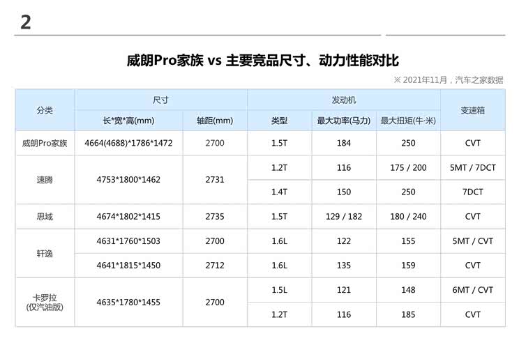 而在威朗Pro的竞争圈层内,其各关键商品性指标又处于同级中的什么水平呢?我们参考这款车型最近的订单量、用户产品关注度等数据,对尺寸、动力及主销版本的配置等特征,与其同价位竞争车,逐一进行量化对比分析。