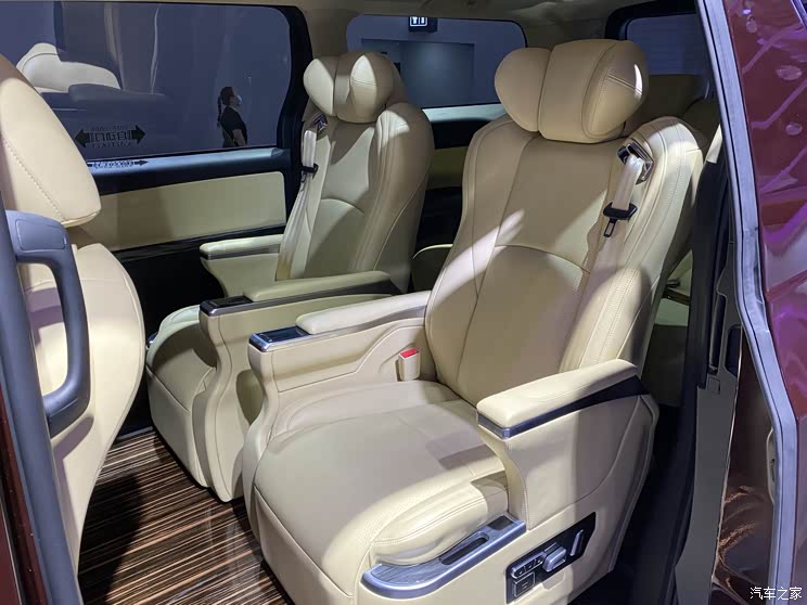来到第二排,可以看到新车搭载了两个独立的航空式座椅,腿托、扶手以及电动调节功能一应俱全,能为搭载的乘客提供舒适的体验。座椅下方还采用木质地板包裹,提升高档感。