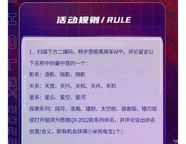 资讯日前,我们从官方获悉,2022款思皓QX(参数|询价)征名活动正式启动。用户可在官方提供的活动链接中进行投票,提供有影系、天系、星系、探索系四个系列共计17个命名可选。当然,用户也可自由发挥为该车