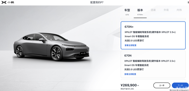 新车上市11月4日,我们从小鹏官网获悉,小鹏汽车P7(参数|询价)新增两款车型上市,售价区间为23.29-26.99万元。新车分别为480N+和670N+,较此前480N和670N车型,主要是新增了1