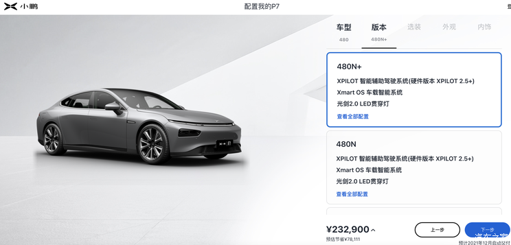 小鹏汽车P7指导售价车型售价(万元)480N+23.29670N+26.99