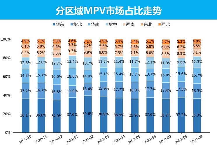 9月MPV销量最高的三个区域为华东、华南、华北地区,合计销量达到了4.6万辆,其合计占比也达到了69.0%,与8月相比,华中、华南地区销量占比处于增长趋势,增幅最大的为华中地区,其增幅达到了2.7%。销量最低的区域为西北地区,销量仅为3181辆。