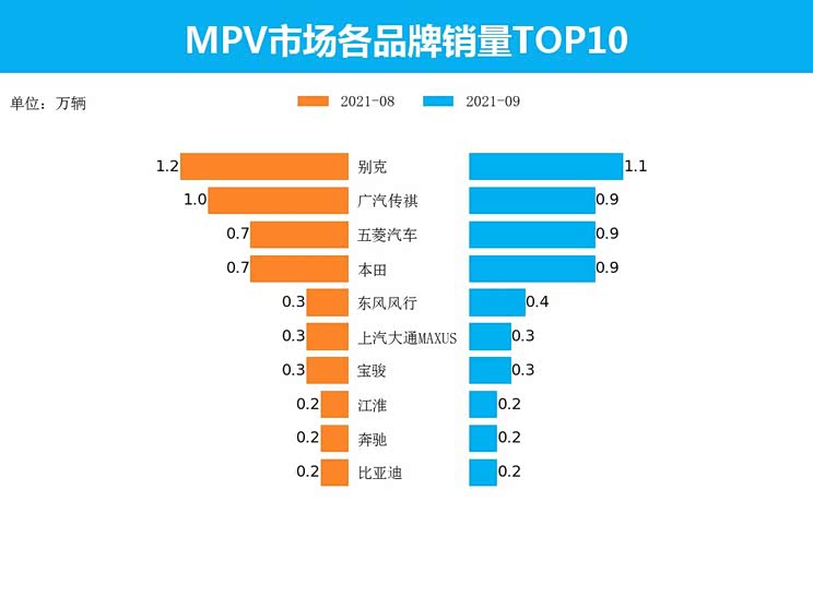 1、9月MPV整体市场共销售6.7万辆,同比下跌11.1%;2、新能源MPV销售3568辆,同比上涨281%;3、中大型MPV最受消费者所青睐;4、别克GL8(参数|询价)以1.1万辆的销量夺得了MPV的冠军。