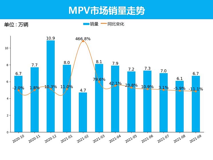 从MPV市场销量情况来看,2021年9月MPV共销售6.7万辆,占整体乘用车市场的4.0%。与8月相比,环比上涨9.4%。与去年同期对比来看,同比下跌11.1%,较上月同比降幅增加5.2%。
