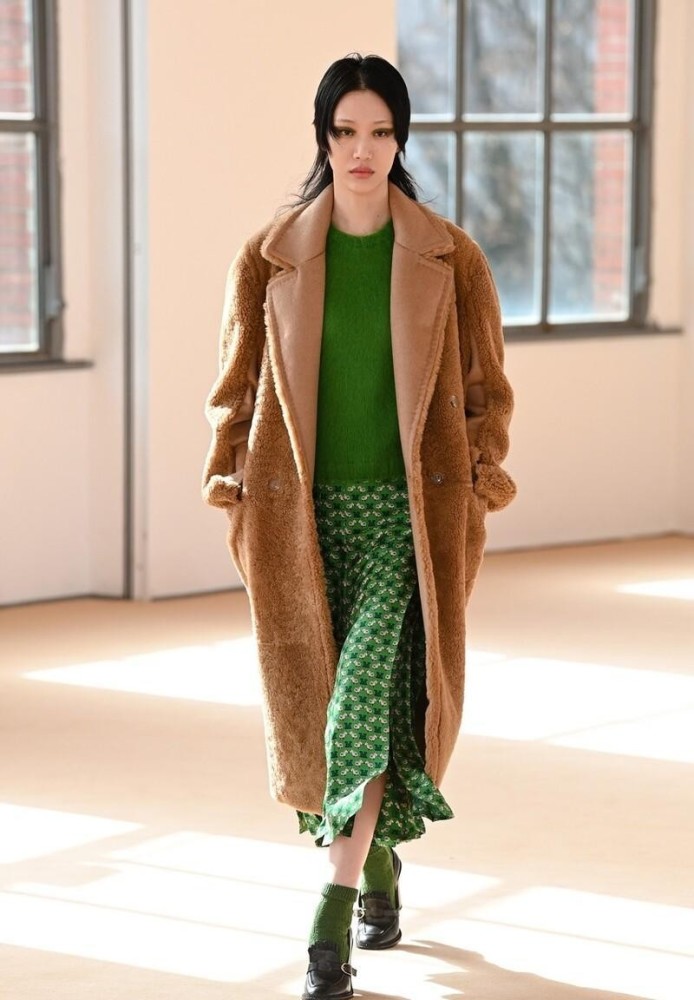 棕色大衣会给人十分优雅的感觉,同时复古感也是非常强烈,所以外棕内绿的搭配,相对来说也更适合成熟女性。内搭一件绿色针织衫或者绿色卫衣,都是很不错的选择。