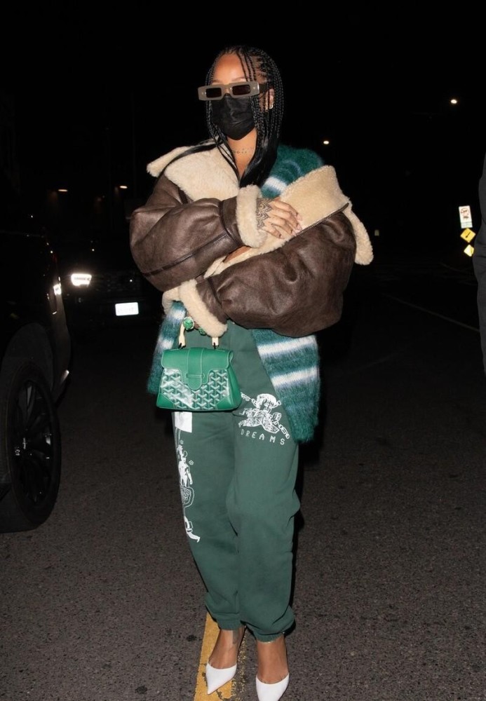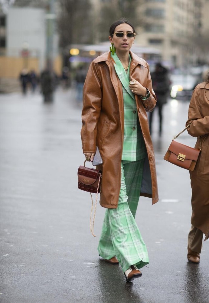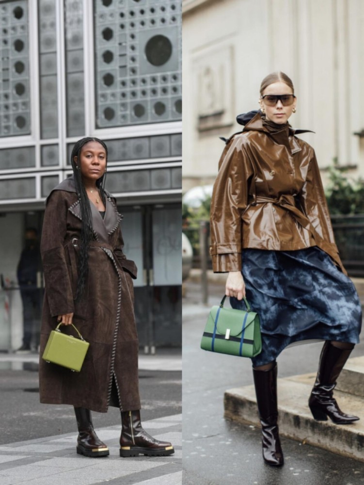 在搭配包包的时候,也是很有讲究的,配绿色的包包时,如果棕色服装采用的是深棕色,那么包包就选择浅绿色,打造出色彩的层次感和对比感,就会让造型看起来更加时髦。