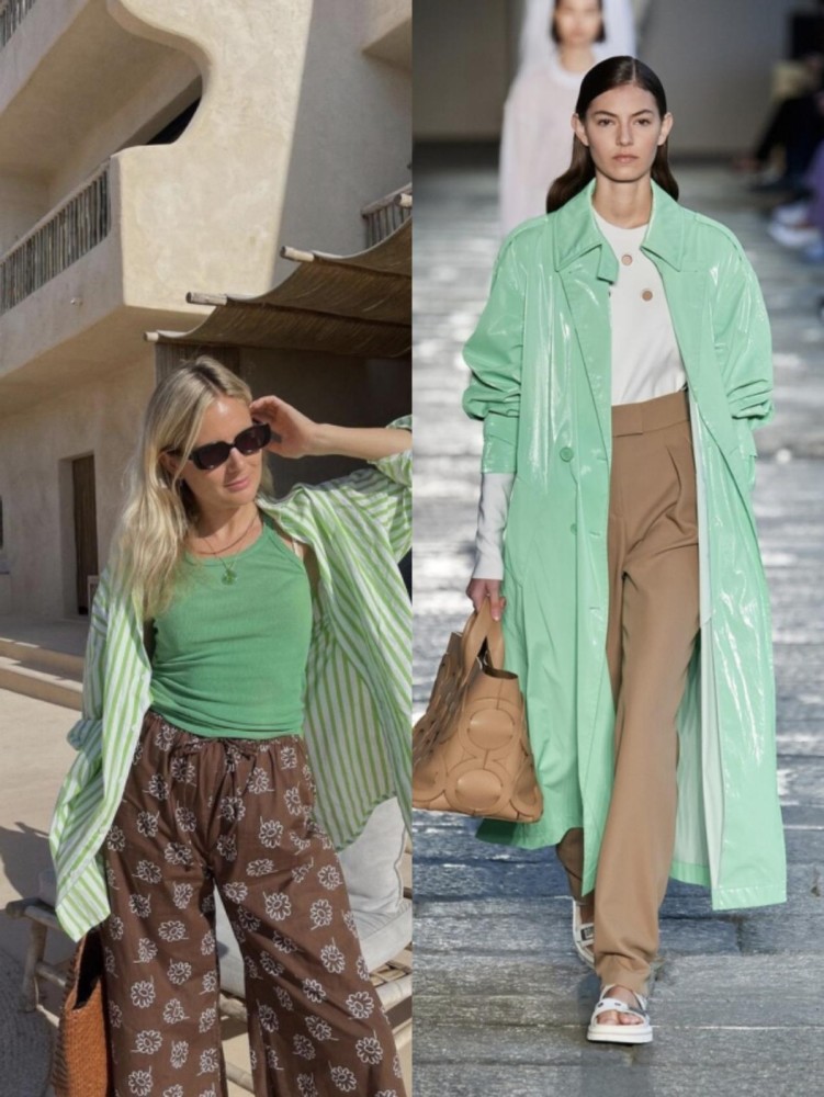 运用外搭和内搭的结合,也是可以打造出色彩的层次感的,大家不仅利用外绿内种的搭配,还凸显出女性的气质,这种搭配,主要展现的是绿色的气质。