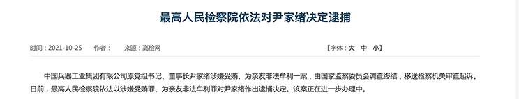 资讯] 近日,据中华人民共和国最高人民检察院官网消息,中国兵器工业集团有限公司原党组书记、董事长尹家绪涉嫌受贿、为亲友非法牟利一案,由国家监察委员会调查终结,移送检察机关审查起诉。日前,最高人民检察
