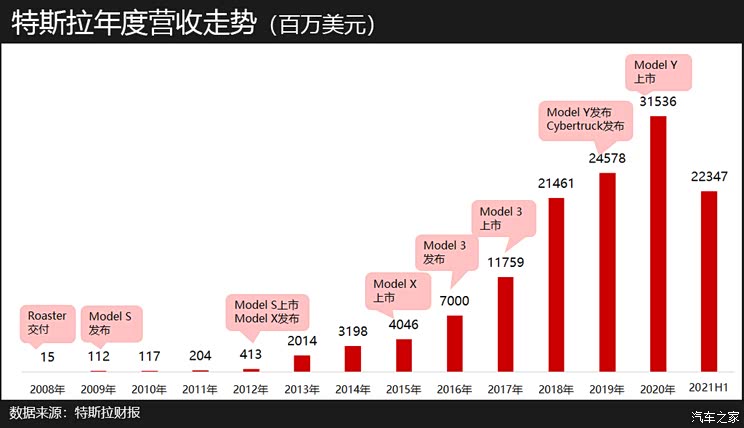 特斯拉的营收来自汽车销售、积分转卖、汽车租赁、软件、光伏储能等业务,其中汽车销售是主体。在相对平价的Model 3上市之前,特斯拉的年度营收都不到100亿美元。2017年Model 3上市带动营收首次超过100亿美元。随着Model 3的持续大规模交付和2020年Model Y的上市,特斯拉的营收也快速增长,2020年超过300亿美元,今年上半年达到223.5亿美元,同比增长了86%。