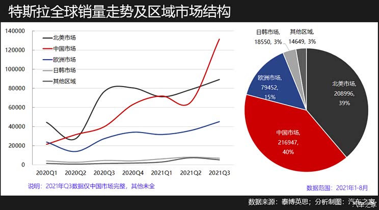基本上,今年没有大的异动的话,特斯拉在全球纯电动市场上的冠军地位没得跑了,即便其他品牌将插混也算进去,赢盘也不大。从现有业绩看,中国市场是其最大的区域市场,占到4成;北美市场是大本营,市场份额比中国略低,但Model S/X这类豪华车型主要的销售地在北美。