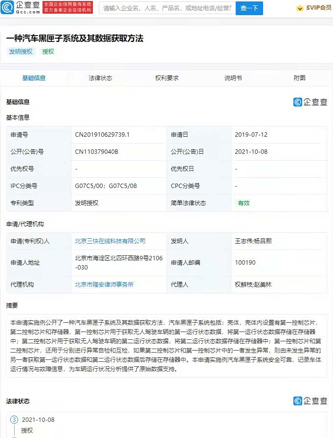 资讯] 从企查查App处获悉,近日美团关联公司北京三快在线科技有限公司“一种汽车黑匣子系统及其数据获取方法”专利获授权,公开号为CN110379040B。
