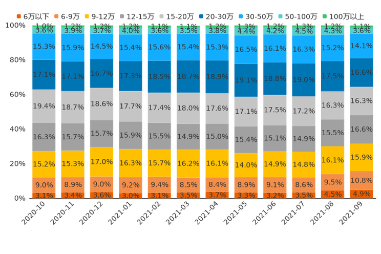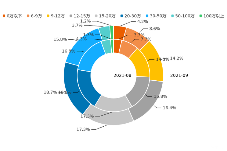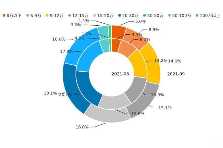通过分析近12个月的用户意向数据发现,2020年10月至今年9月,12万以下价区用户意向占比增加4.3%,随着人们收入水平提高,低价市场热度有所升温;12-20万价区用户意向占比下滑2.8%,市场热度有所下滑;20万以上价区意向占比,下跌1.6%,其中,30-50万价区市场热度下滑明显,汽车消费升级受阻,近12个月用户意向占比下跌1.2%。