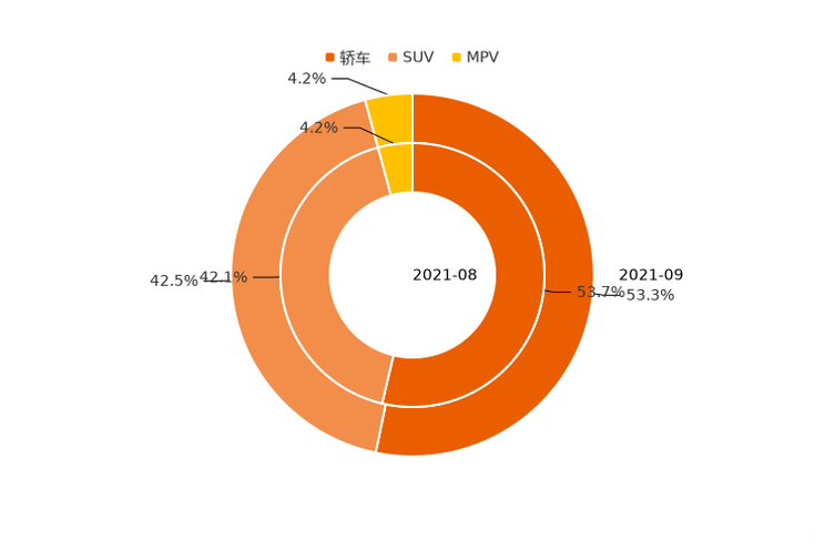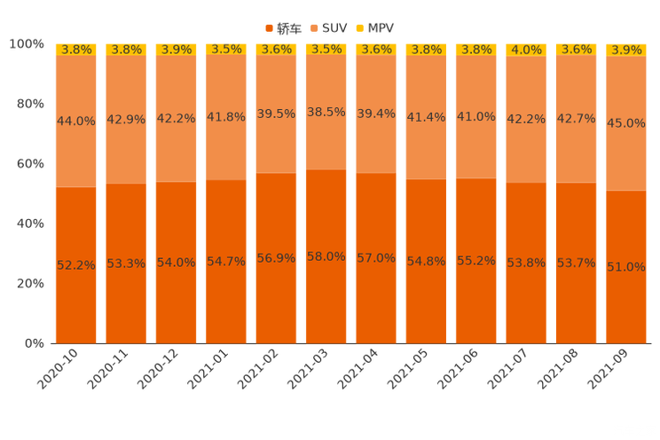 9月,轿车、SUV、MPV用户购车意向占比分别为51.0%、45.0%、3.9%。轿车用户意向占比相较上月下降2.7%,份额持续下滑。SUV用户意向占比延续上涨走势,环比增加2.3%。MPV用户意向占比开始转跌为升,9月环比上升0.3%。