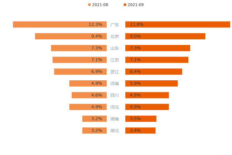今年9月,用户购车意向占比最高的5个省份包括广东、北京、山东、江苏、浙江,广东以11.8%的意向占比独居鳌头。用户购车意向Top 10省份线索份额累计达64.2%,相较上月增加0.4%,市场区域集中度进一步提升。全部省份中有12个省份用户意向占比有所增加,而11个省份的用户意向占比出现下滑,其中,河南、四川、安徽相较上月用户意向占比分别增加1.0%、0.3%、0.3%,为购车意向占比增长最高的3个省份;广东、浙江、上海用户意向占比分别减少0.5%、0.5%、0.5%,为下降最多的3个省份。