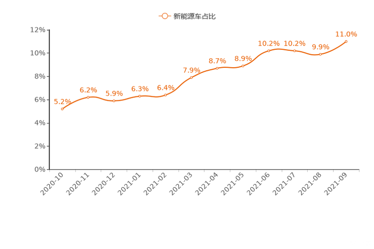 今年9月,乘用车中新能源车用户购车意向占比为11.0%,相较上月小幅上涨1.1%,用户意向占比持续升高。