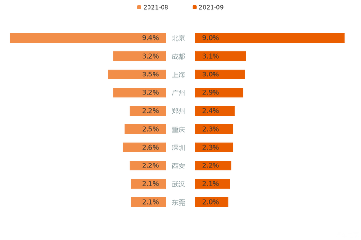 了解了用户购车意向的省份分布,我们再来看一下城市格局。今年9月,用户购车意向最高的5个城市包括北京、成都、上海、广州、郑州,北京以9.0%的购车意向占比荣登榜首,大幅甩开其他城市。Top 10城市用户意向占比累计达31.3%,相较上月降低1.7%,市场城市集中度有所下降。其中,郑州、商丘、淮南相较上月用户意向占比分别增加0.2%、0.2%、0.1%,为意向占比增长最高的3个城市;上海、北京、广州用户意向占比分别减少0.5%、0.4%、0.3%,为下降最多的3个城市。