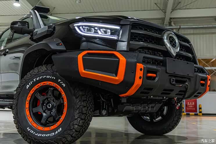 外观方面,长城炮黑弹版全车进行了黑化处理,并辅助亮橙色装饰点缀,前格栅和机盖进行了全新的优化,看上去更加凶猛,宽体轮眉让新车更有野性味道,保险杠棱角分明,硬朗的机甲风格,在保险杠前侧,安装了绞盘,配合前杠正面镶嵌的拖钩可实现快速多场景的陷车救援。车尾的保险杠与车头相呼应,还配备了方口拖钩。车身侧面,黑弹还配备了金属侧踏板,宽大的踩踏区域与表面的防滑设计让乘客从容地进出车厢。