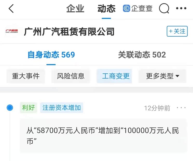 资讯日前,据企查查显示,广州广汽租赁有限公司发生工商变更,公司注册资本由5.87亿元人民币增加至10亿元人民币。该公司成立于2004年,法定代表人为陈良忠,由广汽商贸有限公司100%控股,后者为广汽集