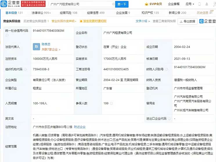 广州广汽租赁有限公司经营范围包含:机器人销售;汽车租赁;汽车销售;二手车销售;汽车零配件销售;担保服务(融资性担保除外);经营保险兼业代理业务等。(编译/ 郭辰)