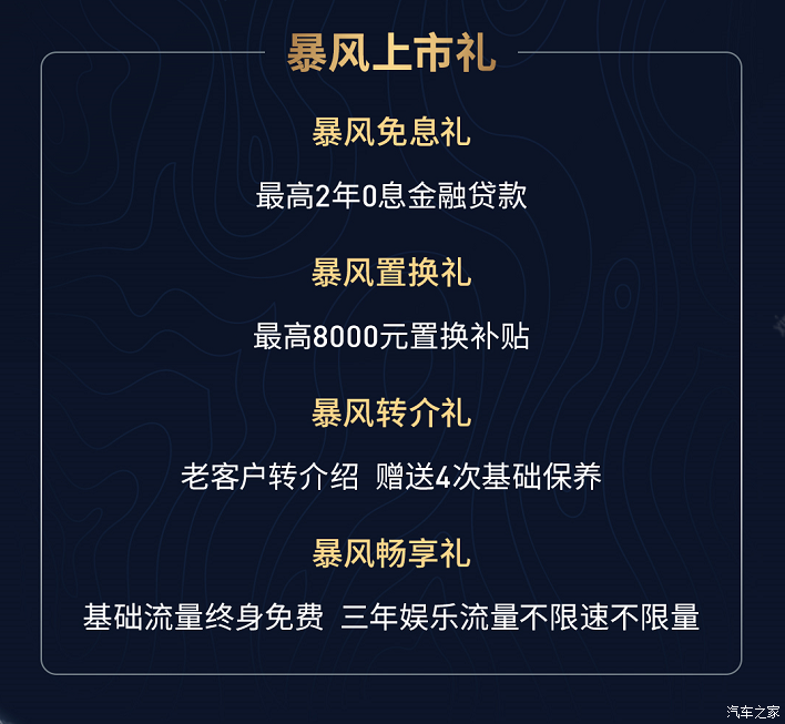 购买新车的消费者可以享受“暴风上市礼”,包含金融、置换、转介、流量等几方面的权益,具体内容见下图:
