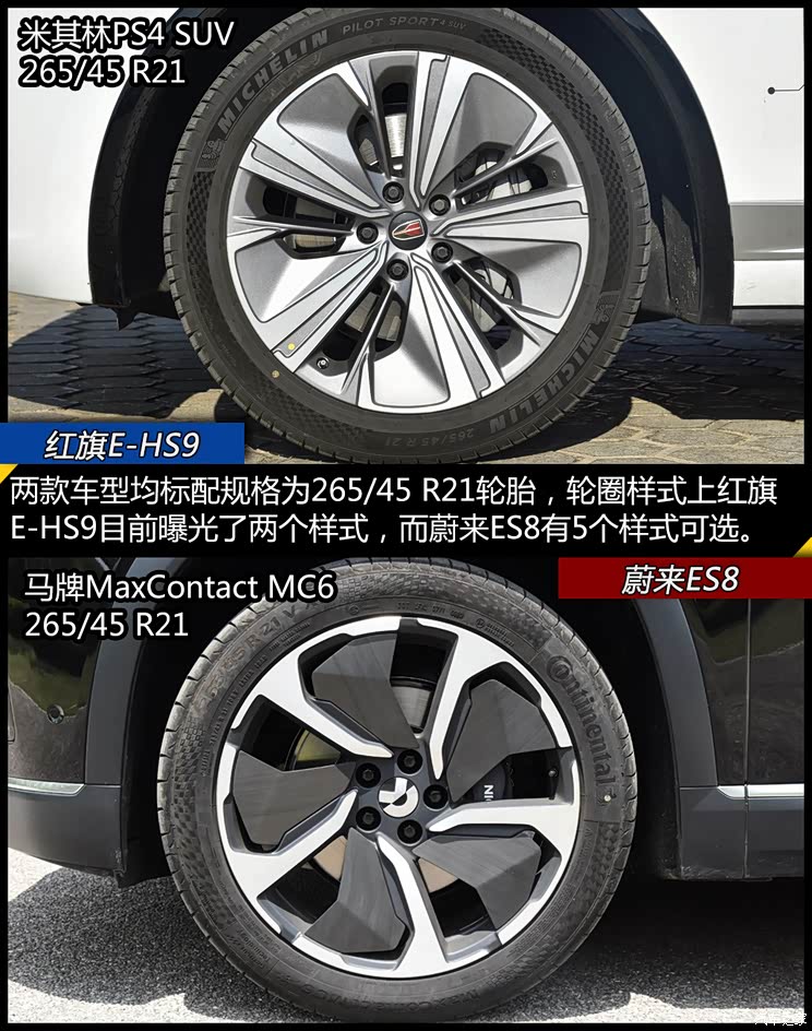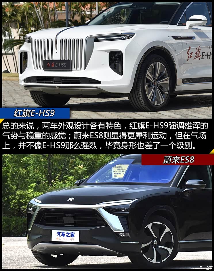 ●外观:红旗E-HS9强调雄浑的气势与稳重的感觉;蔚来ES8则显得更犀利运动,但在气场上,并不像E-HS9那么强烈,毕竟身形也差了一个级别;