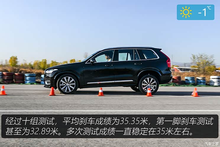 在刹车测试中,XC90第一次“出手”便交出了超跑级别的32.89米的成绩。多次测试后成绩一直稳定在35米左右,可谓发挥非常稳定。从轮胎的宽度来说,沃尔沃并没有“作弊”。毕竟对比竞品车型,例如宝马X5(前275mm/后305mm),它的胎宽并不占优属于正常水平。XC90能有如此优秀的刹车性能着实让BBA旗下的车型倍感压力。