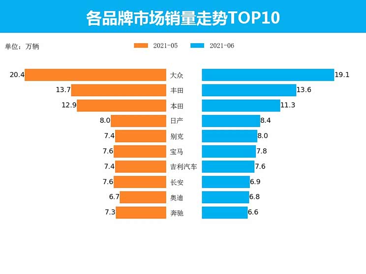 从品牌角度来看,6月乘用车销量最高的五个品牌分别为大众、丰田、本田、日产、别克,其销量占据当月销售总量的36.0%,中国品牌吉利和长安进入TOP10榜单。