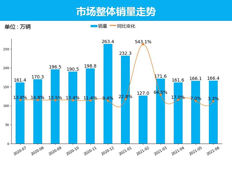 从整体市场销量情况来看,2021年6月乘用车共销售166.4万辆,与5月相比,环比无变化。与去年同期对比来看,同比上涨3.3%,较上月同比增幅收窄3.7%。