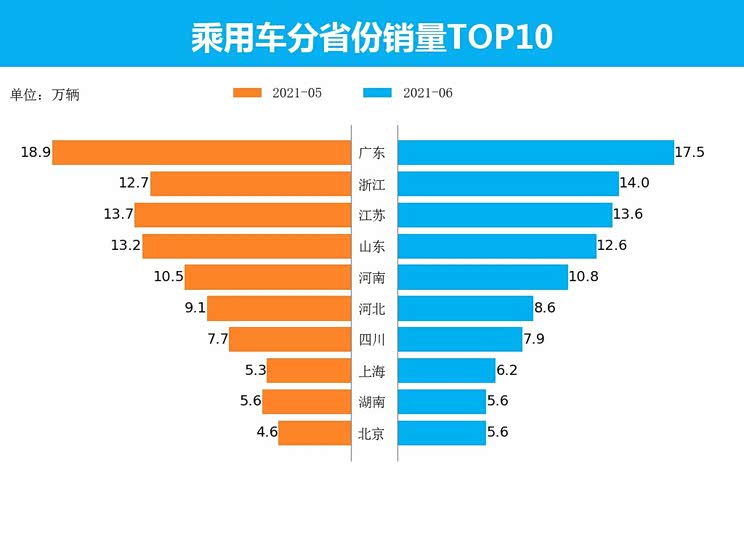 6月乘用车销量最高的5个省份为广东、浙江、江苏、山东、河南,销量分别为17.5万辆、14.0万辆、13.6万辆、12.6万辆、10.8万辆,占总销量的41.0%,其中广东销量占比较5月相比下降0.9%。与5相比,销量上涨幅度最高的三个省分别为浙江、北京、上海,上涨幅度分别为0.8%、0.6%、0.5%。