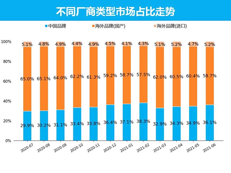 从品牌类型销量来看,6月中国品牌销量为60.1万辆,销量占比为36.1%,较5月增长1.1%;与去年同期相比,中国品牌销量占比增长6%,然而中国品牌近一年来销量占比则呈上升趋势,与海外品牌(国产)的差距在逐渐缩小。海外品牌(国产)销量为97.7万辆,销量占比为58.7%,较5月下降1.7%;与去年同期相比,海外品牌(国产)销量占比下降6.8%,海外品牌(国产)一直保持稳定的趋势,占据着主要的市场份额。海外品牌(进口)销量为8.6万辆,销量占比为5.2%,较5月增长0.5%;与去年同期相比,海外品牌(进口)下降0.2%,进口产品多为价格高的豪华车型,是属于高收入人群的小众需求,因此较为稳定。整体来看,海外品牌(国产)最受消费者所青睐。