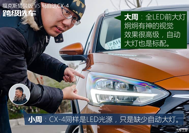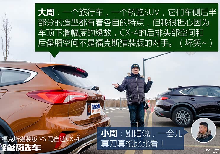 大家好,本期《跨级选车》依旧由周翱(大周)和我(小周/周楚然)搭档主持,对比车型为福克斯猎装版和马自达CX-4。后者是最近很流行的轿跑SUV,另一台则是国内车迷们非常喜爱的旅行车。大周偏爱旅行车,正好我对马自达品牌很有好感,没有争抢,选车过程颇为愉快。