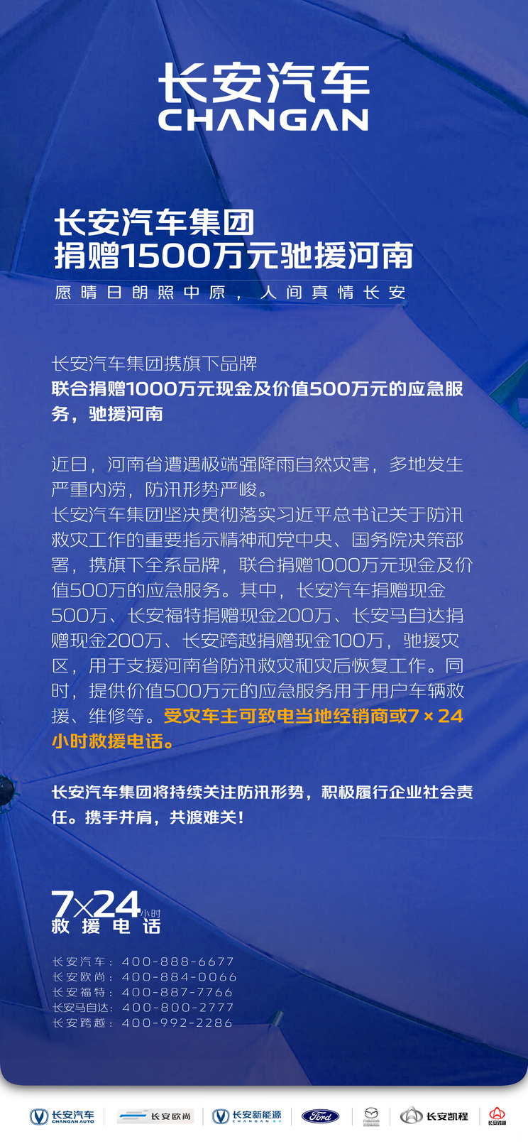 长安汽车集团将持续关注防汛形势,积极履行企业社会责任。携手并肩,共渡难关!7x24救援电话: