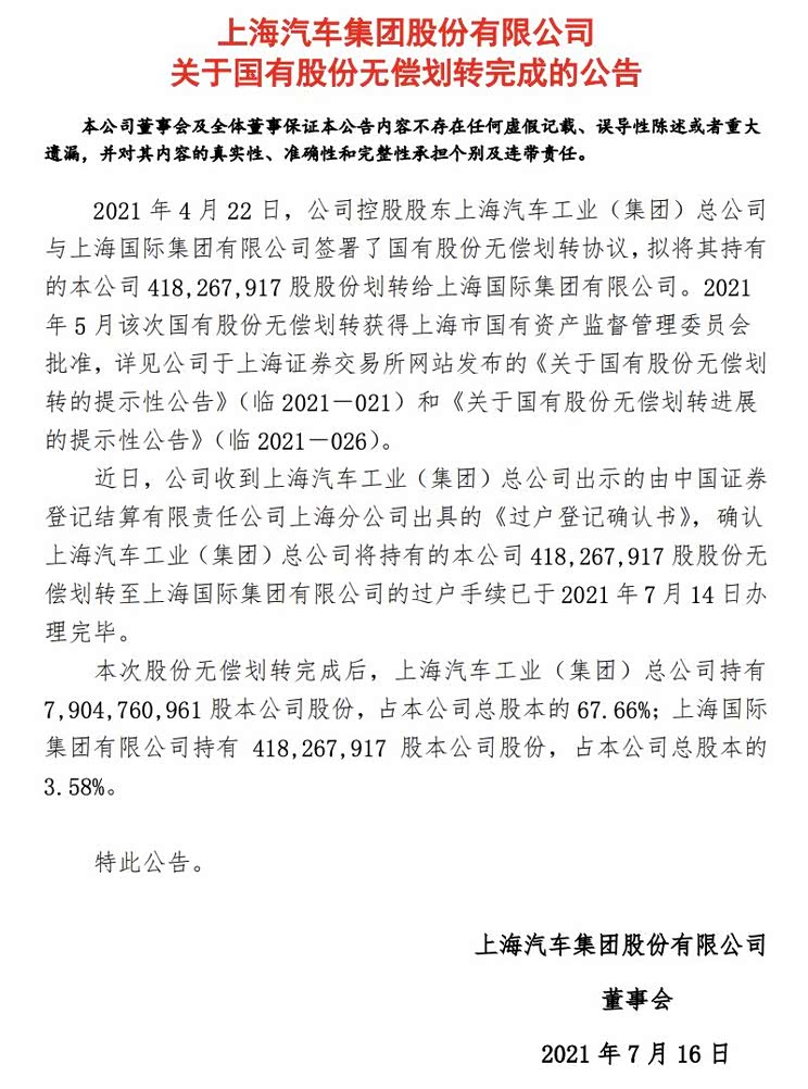 近日,公司收到上海汽车工业(集团)总公司出示的由中国证券登记结算有限责任公司上海分公司出具的《过户登记确认书》,确认上海汽车工业(集团)总公司将持有的本公司418,267,917股股份无偿划转至上海国际集团有限公司的过户手续已于2021年7月14日办理完毕。