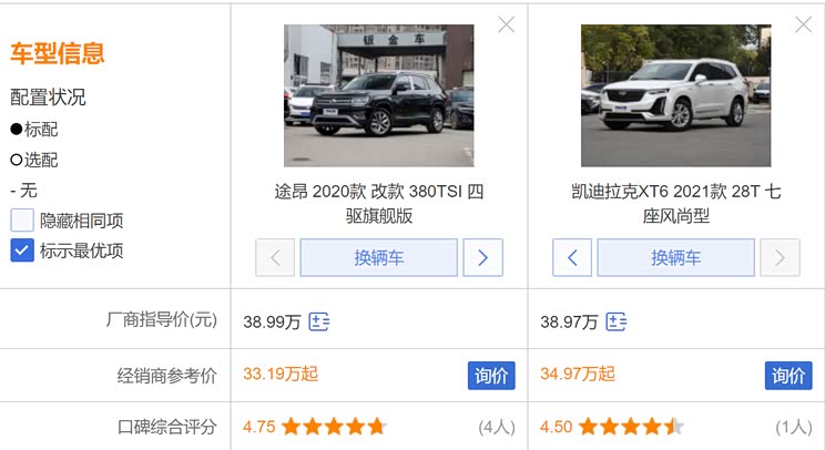 途昂 2020款 改款 380TSI 四驱旗舰版车型首页 | 参数配置 | 图片 | 口碑 | 车型报价厂商指导价38.99万凯迪拉克XT6 2021款 28T 七座风尚型车型首页 | 参数配置 | 图片 | 口碑 | 车型报价厂商指导价38.97万