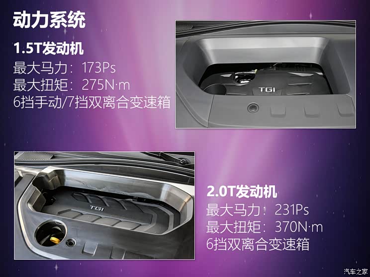 动力部分300TGI车型使用1.5T发动机,最大功率173马力;最大扭矩275牛·米。两款低配车型匹配6挡手动变速箱,三款中高配使用7挡湿式双离合变速箱。400TGI车型使用2.0T发动机,参数非常耀眼,传动系统匹配6挡湿式双离合变速箱。