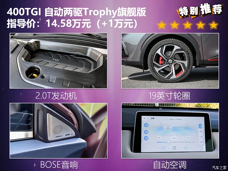 除了最低配和顶配之外,其余车型之间都是1万元的差价,说多不多说少不少,这也让不少朋友面对配置表的时候有点纠结,不知道在这7款车重怎么选。最后给大家总结一下,对动力需求不高,以代步为主的话买11.58万的300TGI 自动两驱燃动豪华版;预算相对充足且看重配置表现的话买13.58万的300TGI 自动两驱Trophy智尊版;动力配置两手抓的话就买14.58万的400TGI 自动两驱Trophy旗舰版。(文/图 侯云峰)