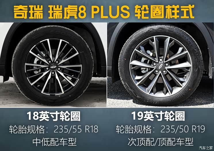 瑞虎8 PLUS提供两种轮圈样式,中低配车型使用18英寸轮圈,双色涂装,轮胎规格为235/55 R18,次顶配和顶配车型采用19英寸轮圈,造型更立体,轮胎规格为235/50 R19,全系标配非全尺寸备胎。