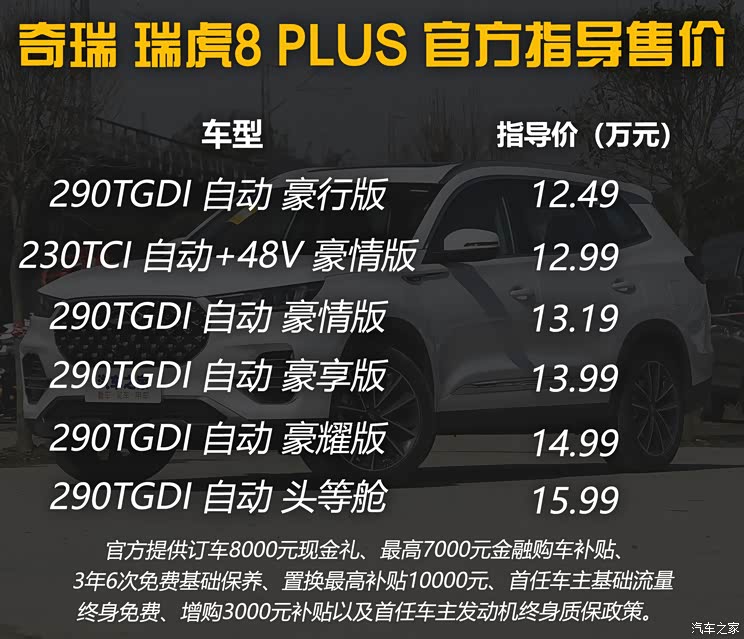 瑞虎8 PLUS共推出6款车型,售价区间为12.49-15.99万元。新车基于奇瑞T1X平台开发打造,提供两种动力规格,定位略高于现款瑞虎8,更强调年轻化。另外,新车标配5座形式,可选装6座/7座。