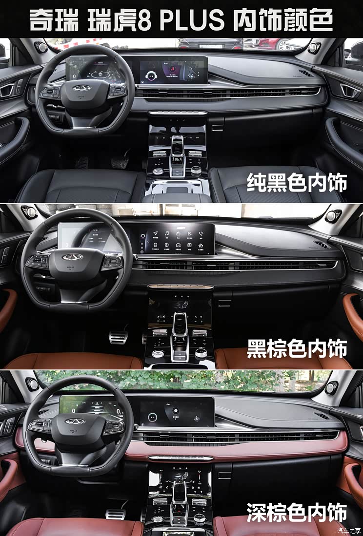 内饰方面,瑞虎8 PLUS的设计与瑞虎8有明显区别,虽然大部分零部件共用,但布局及配置上进行了调整,高级感有一定提升。瑞虎8 PLUS提供三种内饰颜色,分别为纯黑色、黑棕色和深棕色。其中,中低配车型采用纯黑色内饰,中高配车型采用黑棕色内饰,而深棕色内饰为顶配车型专属。