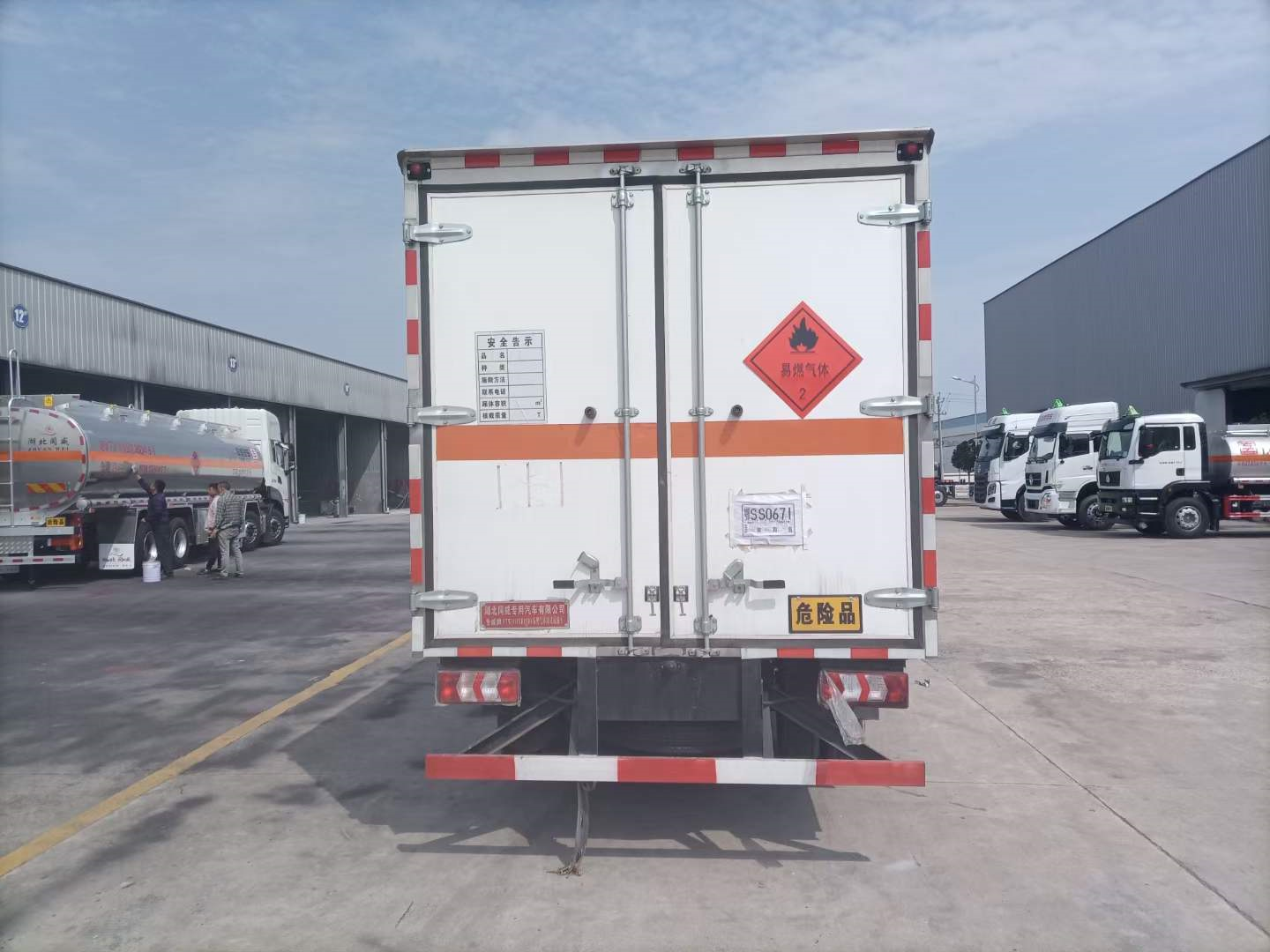 厢体为双层金属骨架结构,外冷轧钢板内饰铝板,内壁采用铝合金板蒙面,夹层为隔热阻燃材料填充,厢体内部做通风窗口,右开单侧门,厢体内部做防静电处理,厢体底部铺导静电胶板,车辆副梁配备导静电带,厢体内衬壁装单排卧环,厢体内顶部安装烟感报警器,厢体安装防盗报警器。随车配备手提灭火器,危险品三角顶灯,防护帽等,严格按照国家危险品法规进行 标识粘贴等。随车资料:机动车上户发票,整车合格证,底盘合格证,随车工具,服务手册,保修手册