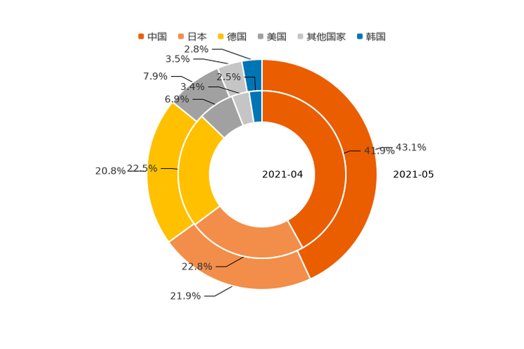 从国别情况来看,5月中国品牌SUV销量占SUV整体销量的43.1%,环比4月增长1.2%。德国、日本、美国、韩国和其他国家乘用车分别占乘用车销量的20.8%、21.9%、7.9%、2.8%和3.5%。与上个月相比,德国、日本(81)品牌销量占比皆有所下降。