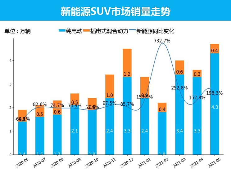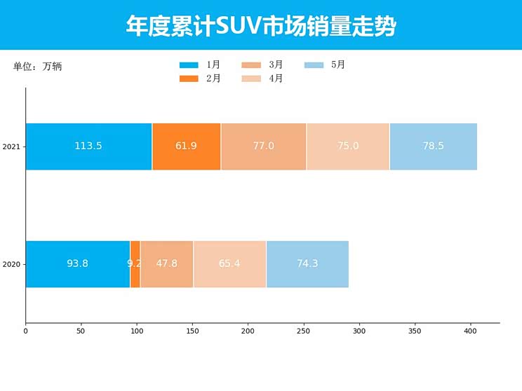 从累计销量数据来看,2021年1-5月,SUV累计销量406.0万辆,同比累计上涨40%。较去年累计情况相比,SUV累计销量增幅上涨61%。