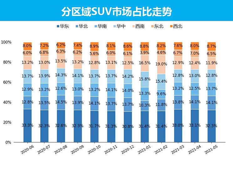 七.分区域SUV市场销量走势:华东、华北、华南地区销量占比呈增长趋势