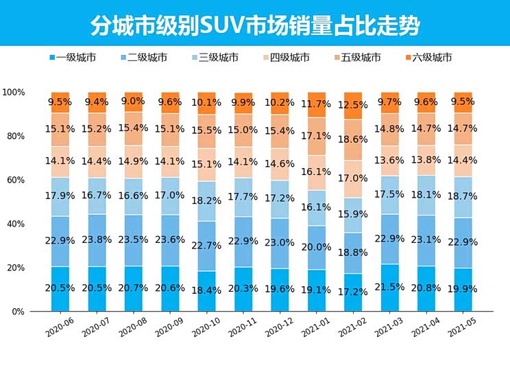 5月SUV销量最高的城市级别为二级城市,销量为17.9万辆,销量占比为22.9%,比4月下降0.2%;与去年同期相比,增长0.1%,一线城市人口规模大,消费能力强,同时限购政策也导致需求更加平稳。一级城市、二级城市、五级城市、六级城市销量占比较4月有不同程度的下滑,三级城市、四级城市较4月相比实现销量份额的提升。