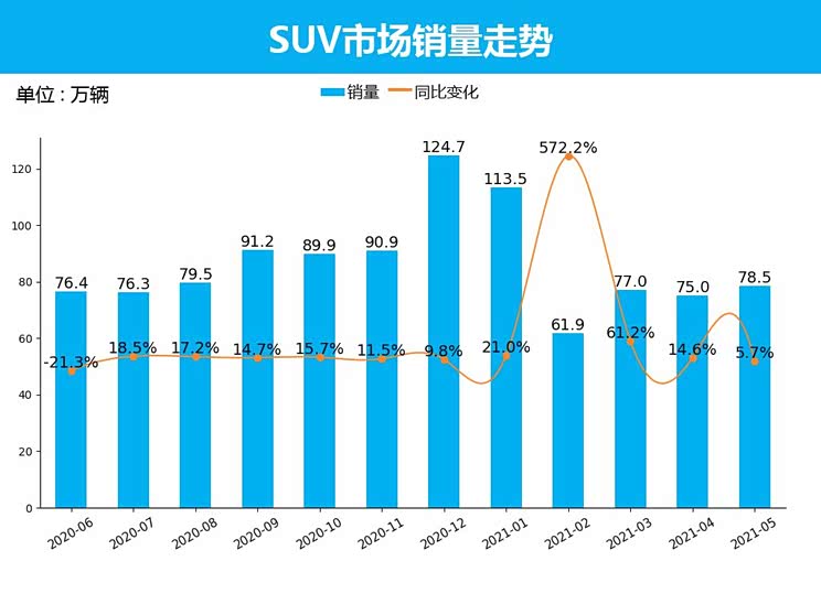行业国内SUV市场在2021年5月的销量成绩已经出炉。5月SUV共销售78.5万辆,占整体乘用车市场的47.3%。让我们一起来看一下5月SUV市场销量走势分析。