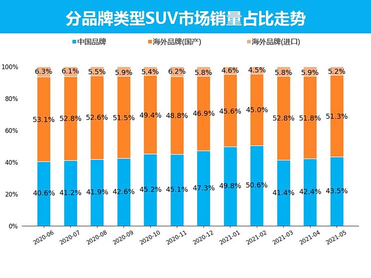 四.分品牌类型SUV市场销量走势:海外品牌(国产)最受消费者所青睐
